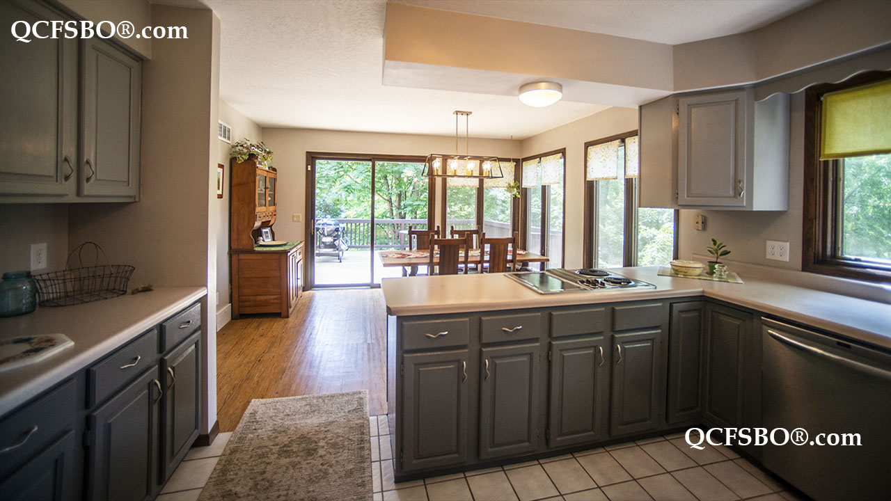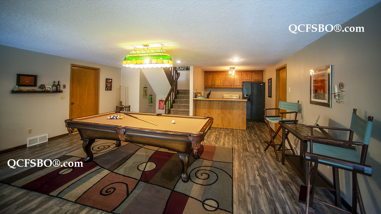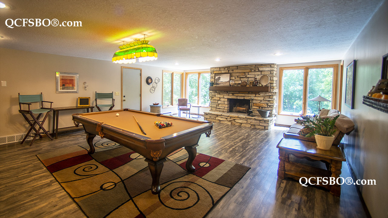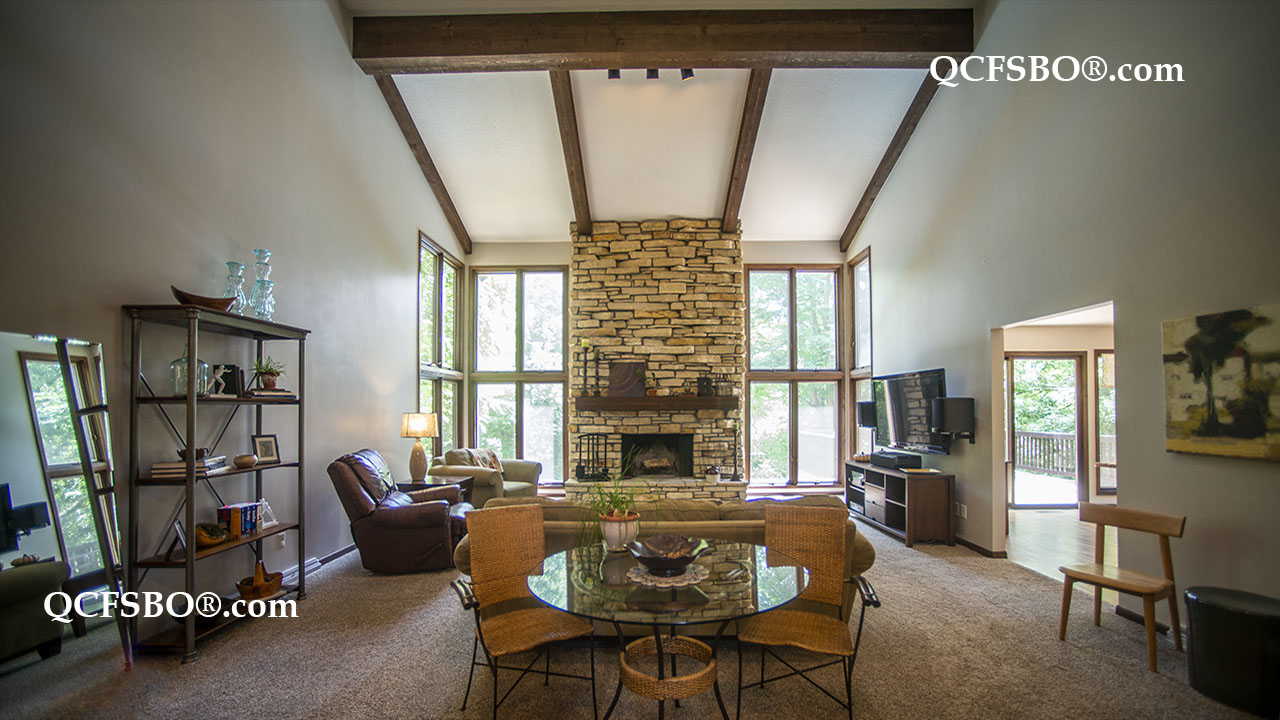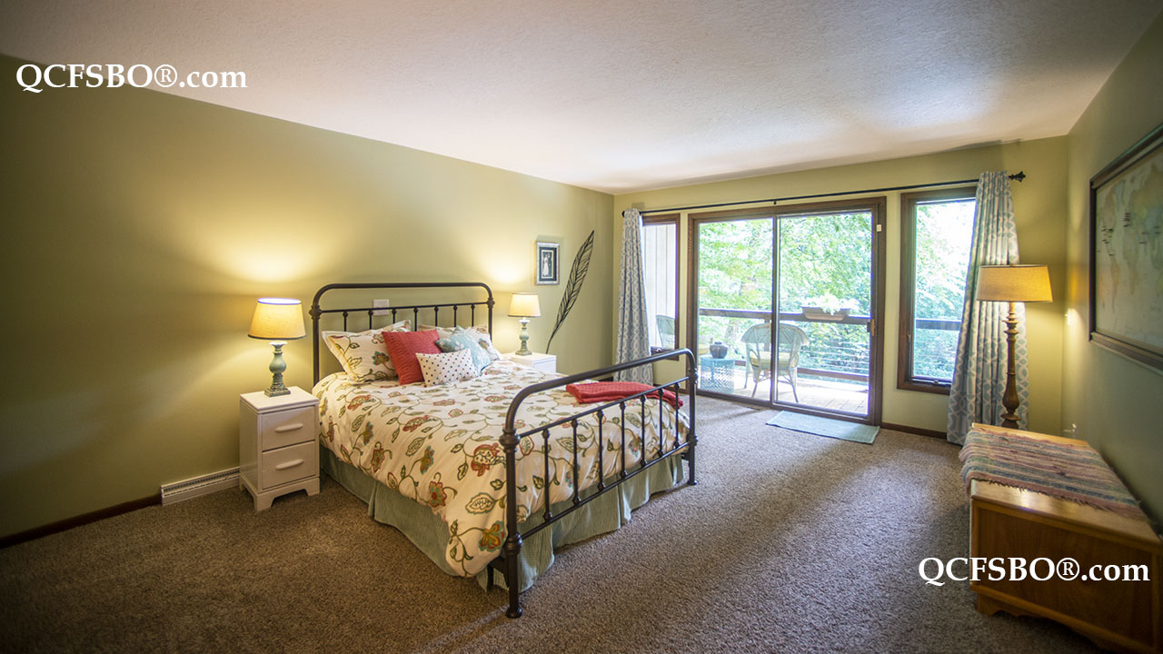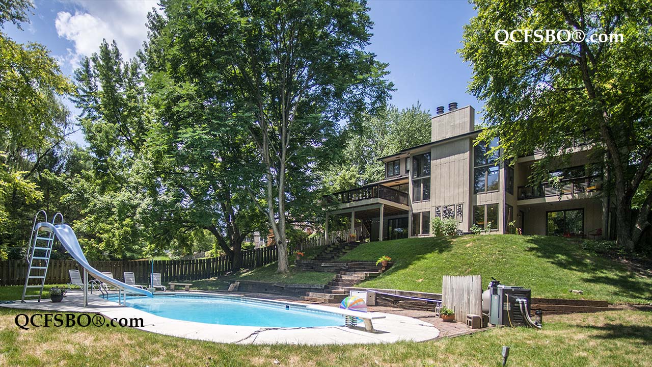 n amazing location for this unique home! Minutes to groceries, shopping, and kid's activities, as well as short walk to Paul Norton Elementary. Two story living room with floor to ceiling windows and limestone fireplace, and a vaulted/beamed ceiling. A large deck off the dining room is right at the tree line on this private wooded lot. This five bedroom house has three bedrooms that feature a walk-in closet and en-suite! The main floor and 2nd floor master bedrooms have sliding glass doors to their own private balcony. The basement is fully finished with a rec room that has a second stone fireplace, a kitchenette/bar, and large bonus room. There are three walk-outs from the basement to the backyard, which is fenced and secluded with a large in-ground heated swimming pool.